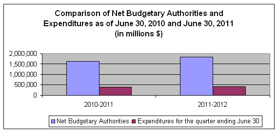 As at June 30, 2011, total authorities available for the year have increased by $214.4 million, or 13% compared to the same quarter of the previous year, from $1,632.1 million in 2010-11 (comprised of Main Estimates and Supplementary Estimates (A)) to $1,846.5 million in 2011-12 (comprised of Main Estimates only).