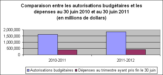 Au 30 juin 2011, les autorisations ont augmentées de 214.4 millions de dollars (13 %) par rapport au même trimestre de l'année précédente qui étaient de 1,632.1 millions de dollars (composé du Budget principal des dépenses et du budget supplémentaire (A)) et à 1,846.5 millions de dollars en 2011-2012 (composé uniquement du Budget principal).